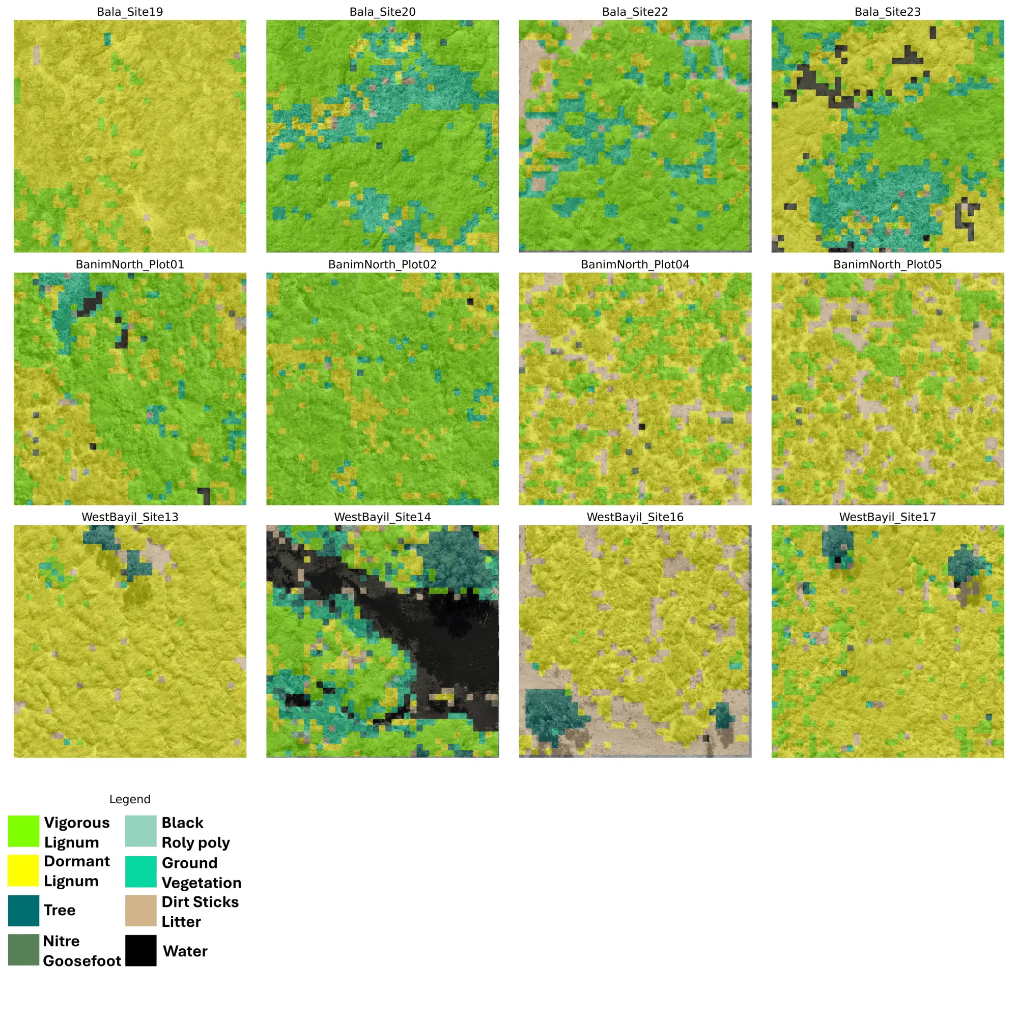 The team stitched together the raw images and clipped them to predefined 50 m × 50 m plots. A deep-learning approach called convolutional neural networks digitally assigned the image contents of the plot to one of 9 classes. The deep-learning algorithm can identify how much of the 50 m × 50 m plot is covered by vigorous or dormant lignum as well as how much is nitre goosefoot, black roly-poly (both shrubs), trees, bare ground, water or other litter. The identification accuracy was 91%, and our methods are continuously improving as the neural networks continue to learn from an ever-expanding collection of images.
